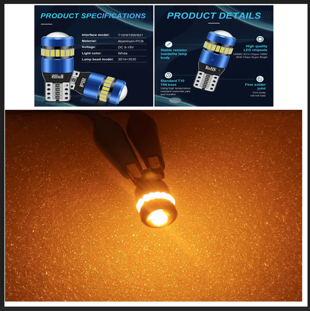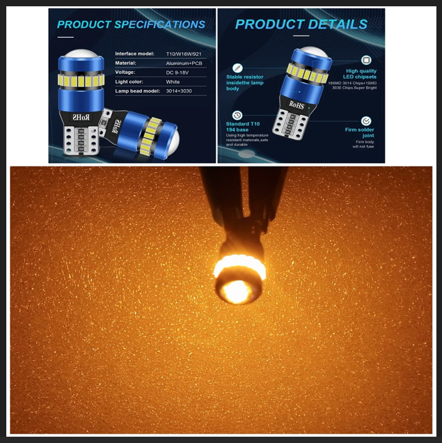 ( 2 X ADET ) 1 TAKIM CANBUS T10 LED DİPSİZ AMPUL 18+1 AMBER 750LM 3030 SMD LENS ROHS LED