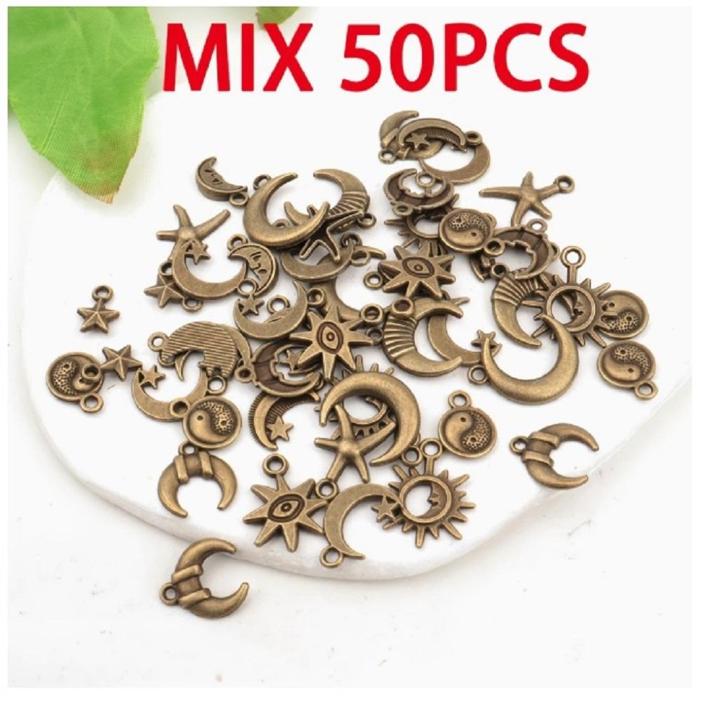 (50 X ADET) 1 SET KARIŞIK ANTİKA BRONZ GÜNEŞ & AY & YILDIZ / BİLEKLİK & KÜPE & KOLYE