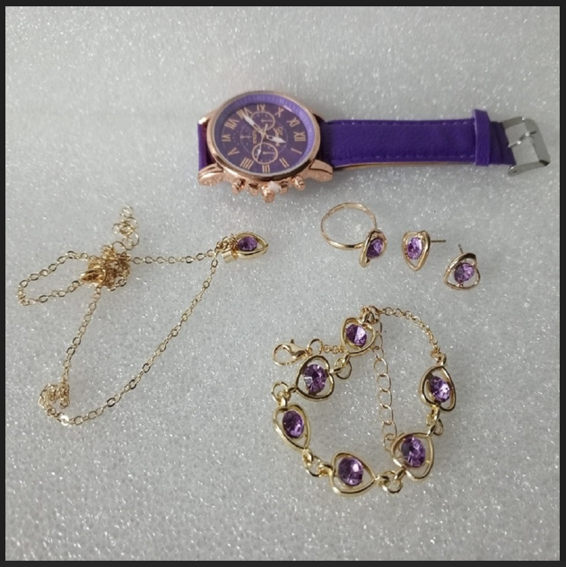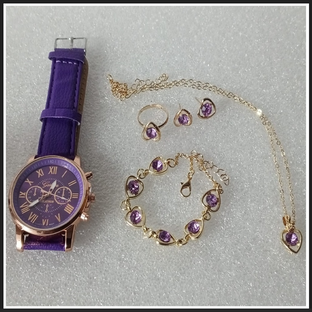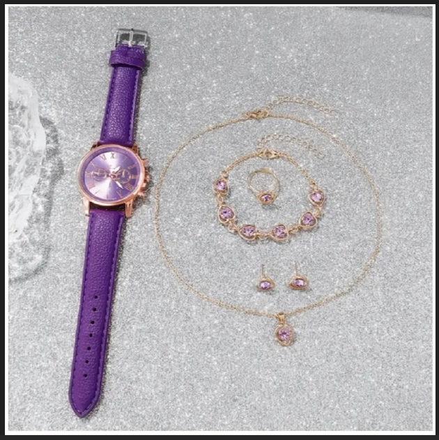 ( 6 X PARÇA ) TIME PURPLE SAAT + KALP KUPE +KOLYE + BİLEKLİK + YÜZÜK TAKI SETİ MOR