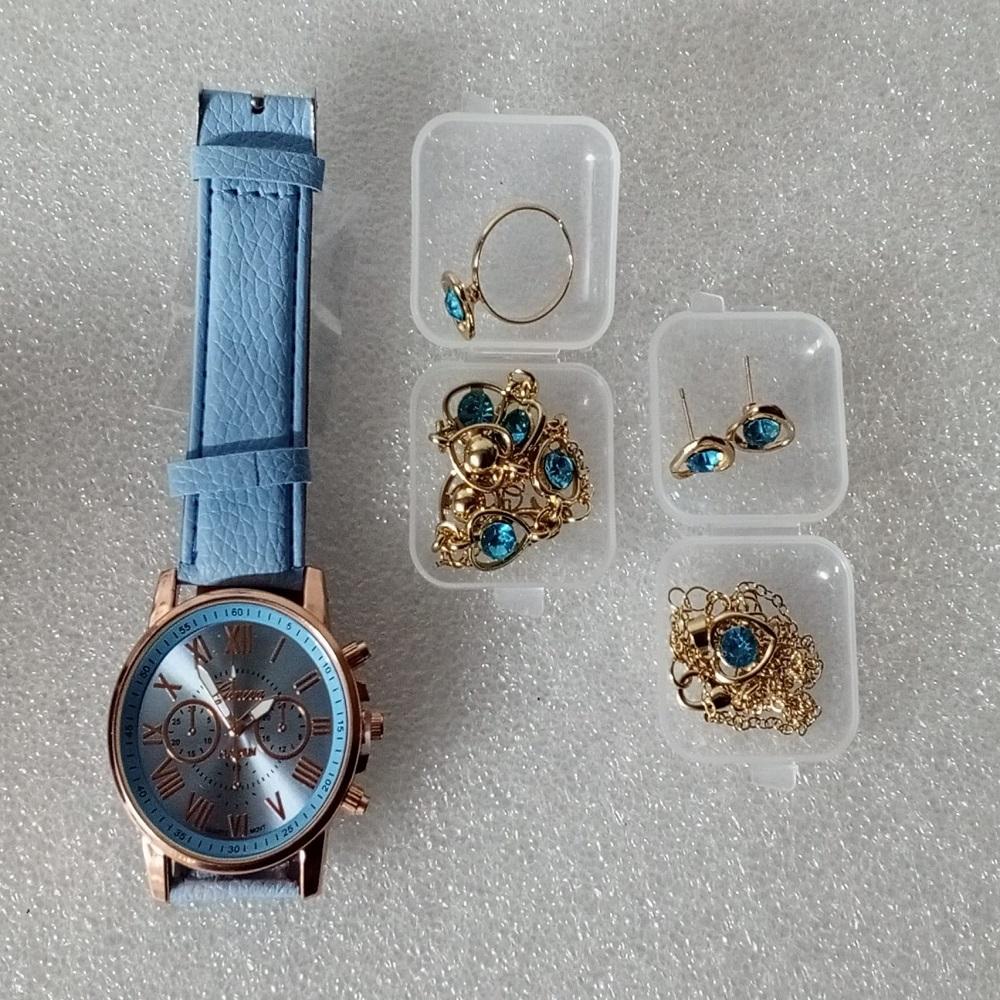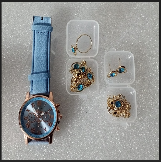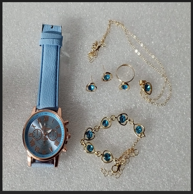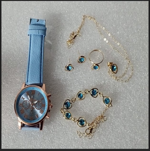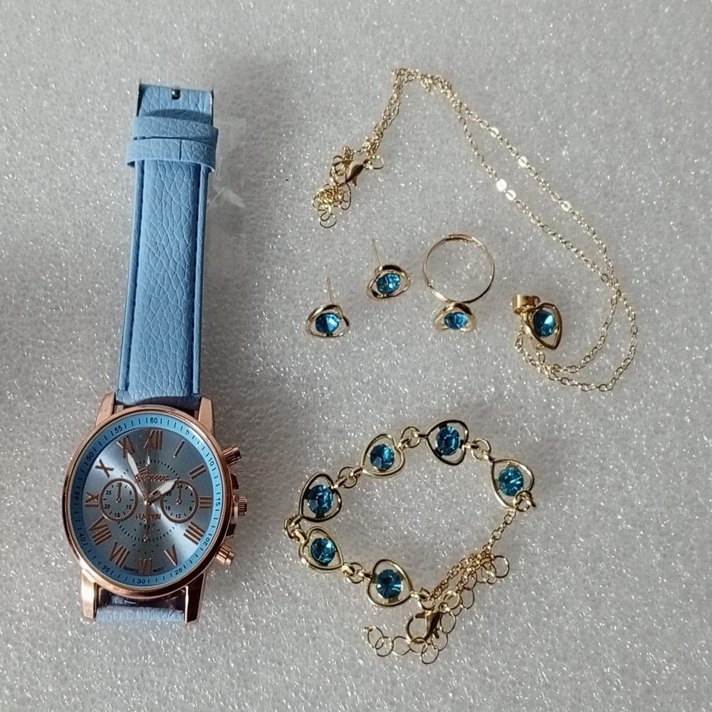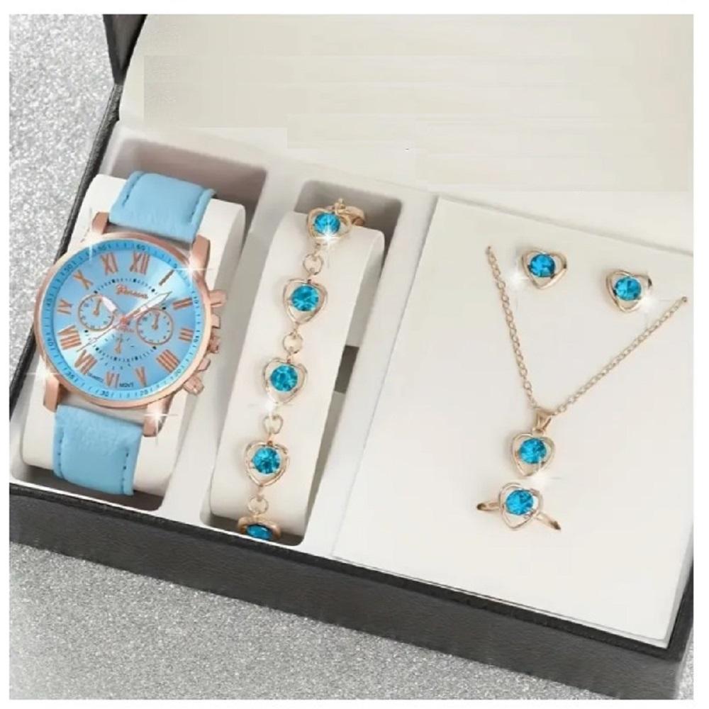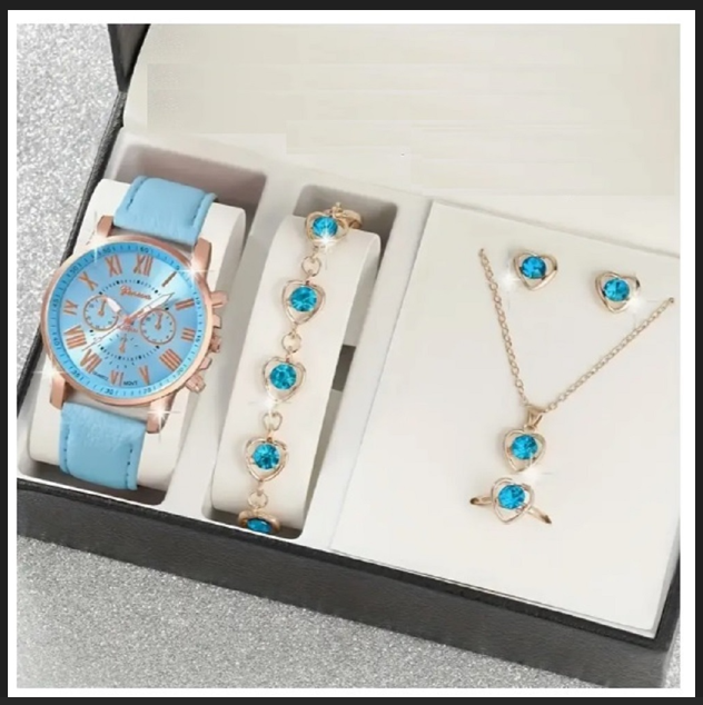 ( 6 X PARÇA ) TIME SKY BLUE SAAT + KALP KUPE +KOLYE + BİLEKLİK + YÜZÜK TAKI SETİ GÖKYÜZÜ MAVİ