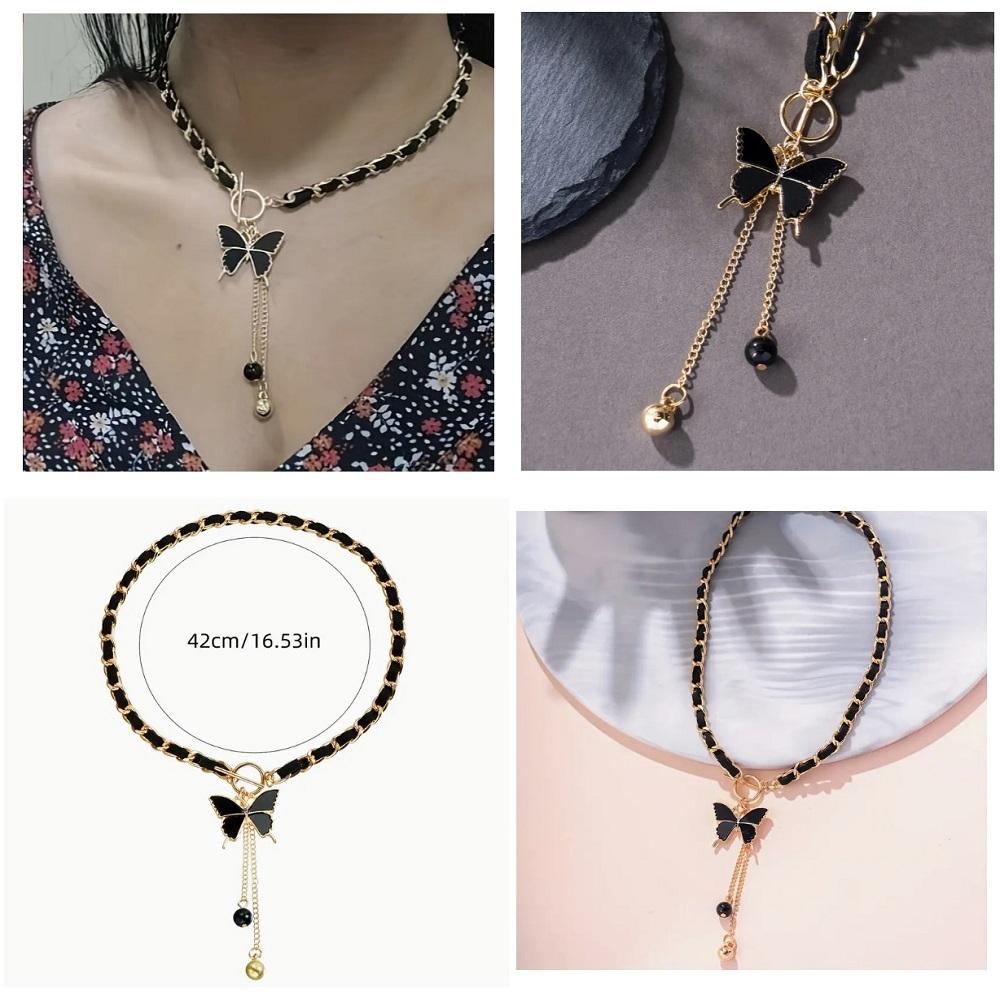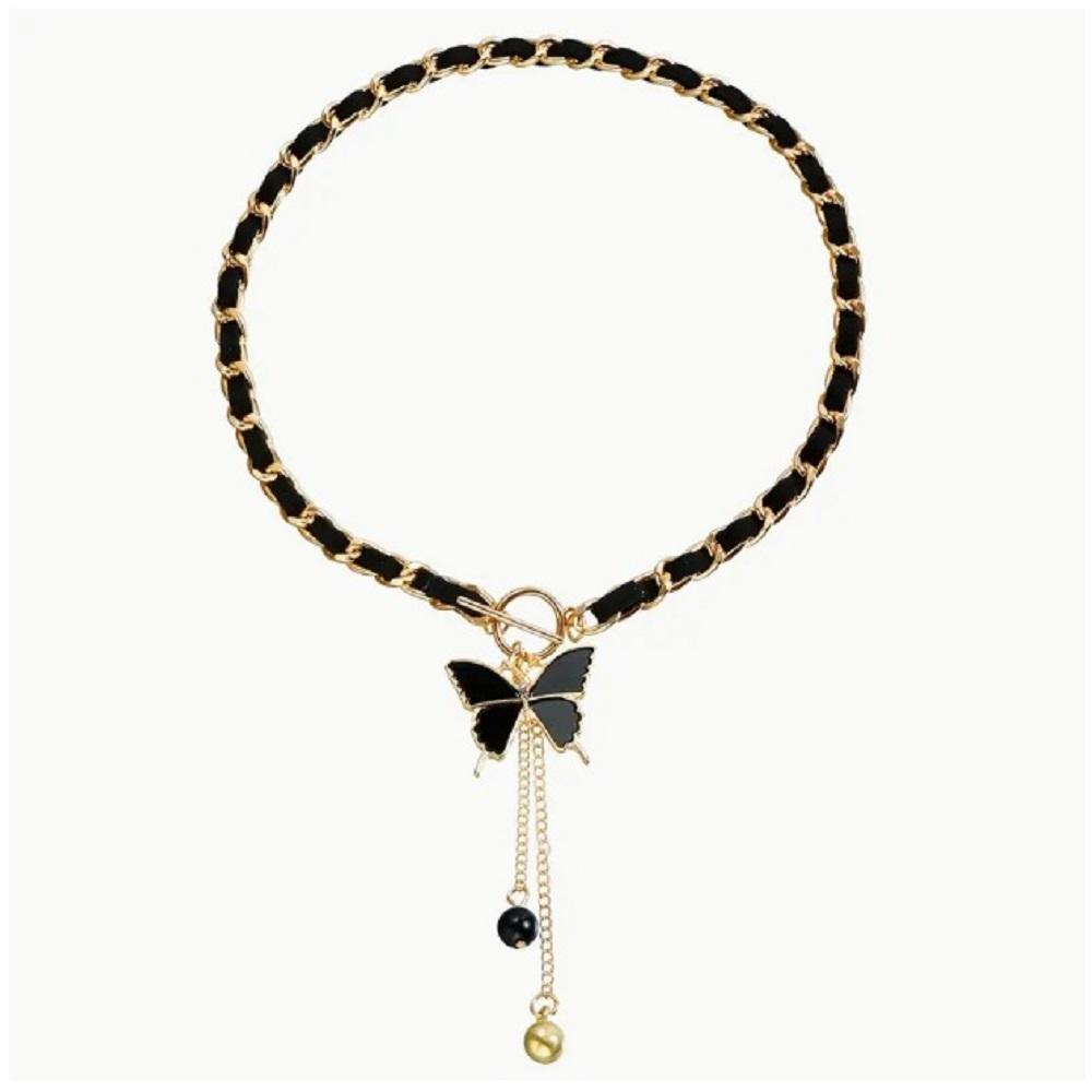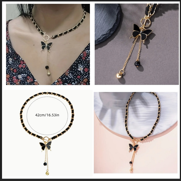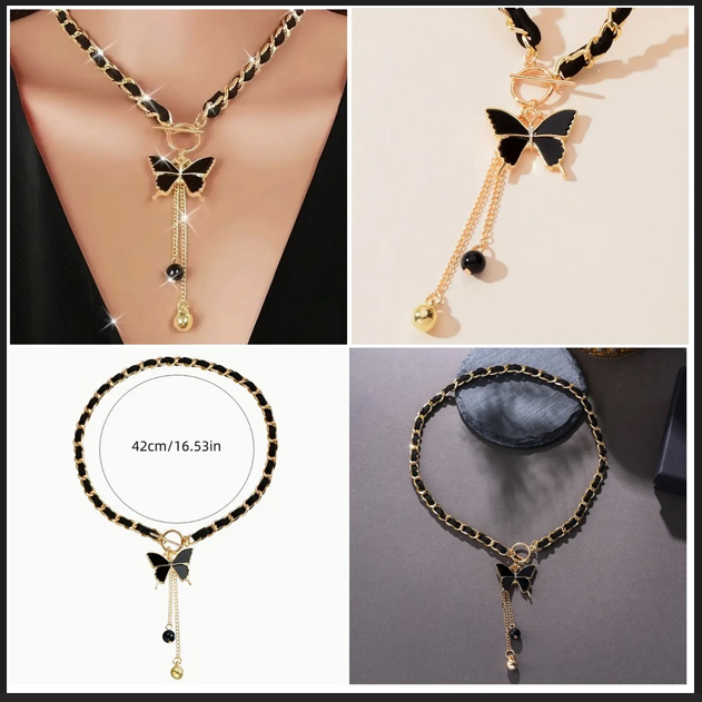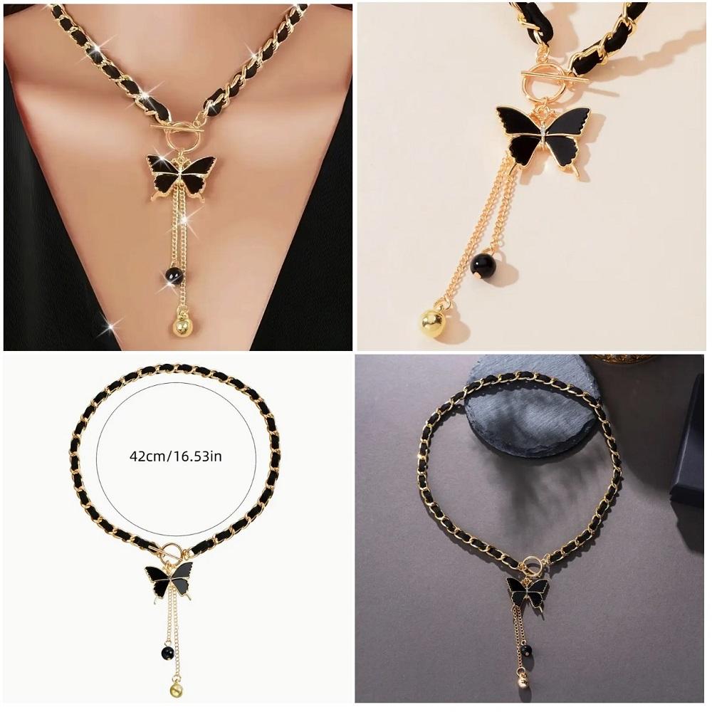 GÜNLÜK GİYİM SİYAH UZUN ALTIN TONLU BONCUK VURGU SİYAH KELEBEK KOLYE