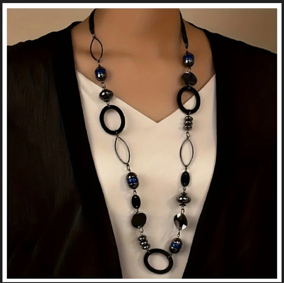 OFFICE NECKLACE GÜNLÜK GİYİM BOHO TARZI REÇİNE TAŞLI SİYAH UZUN OFİS KOLYE