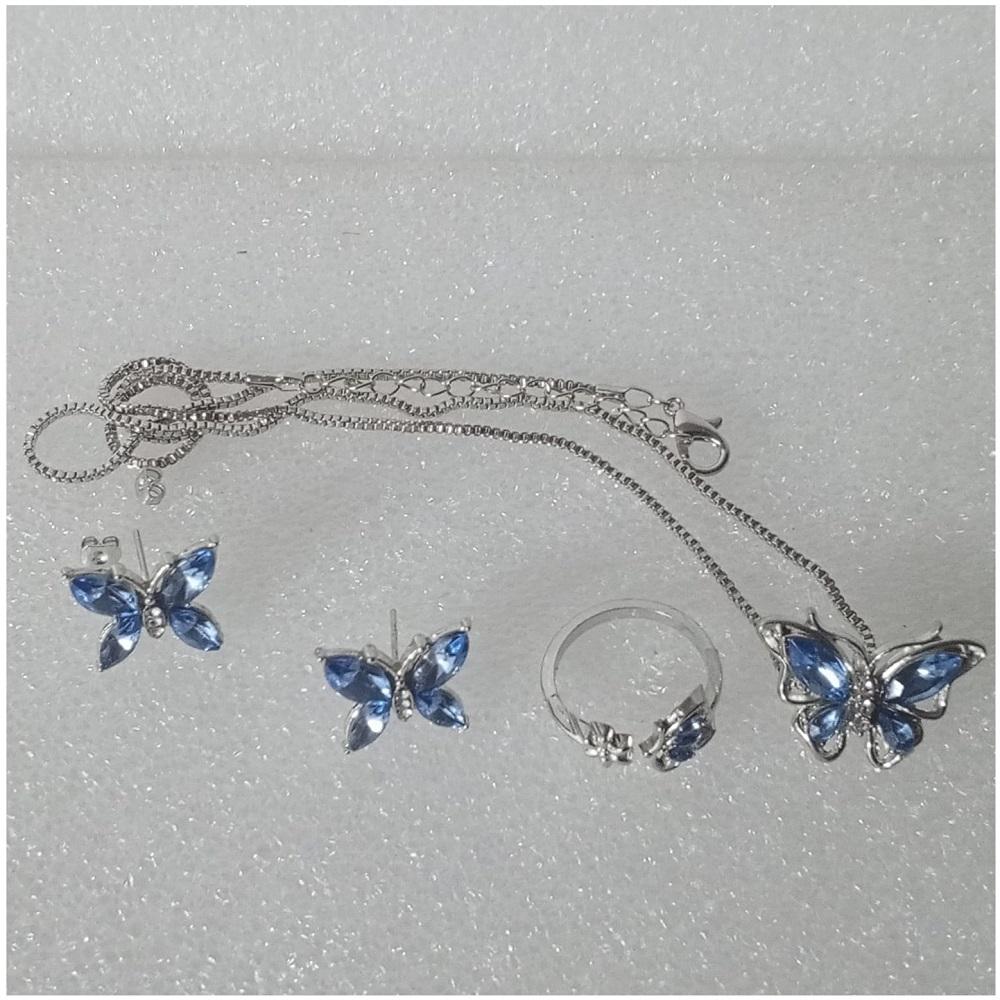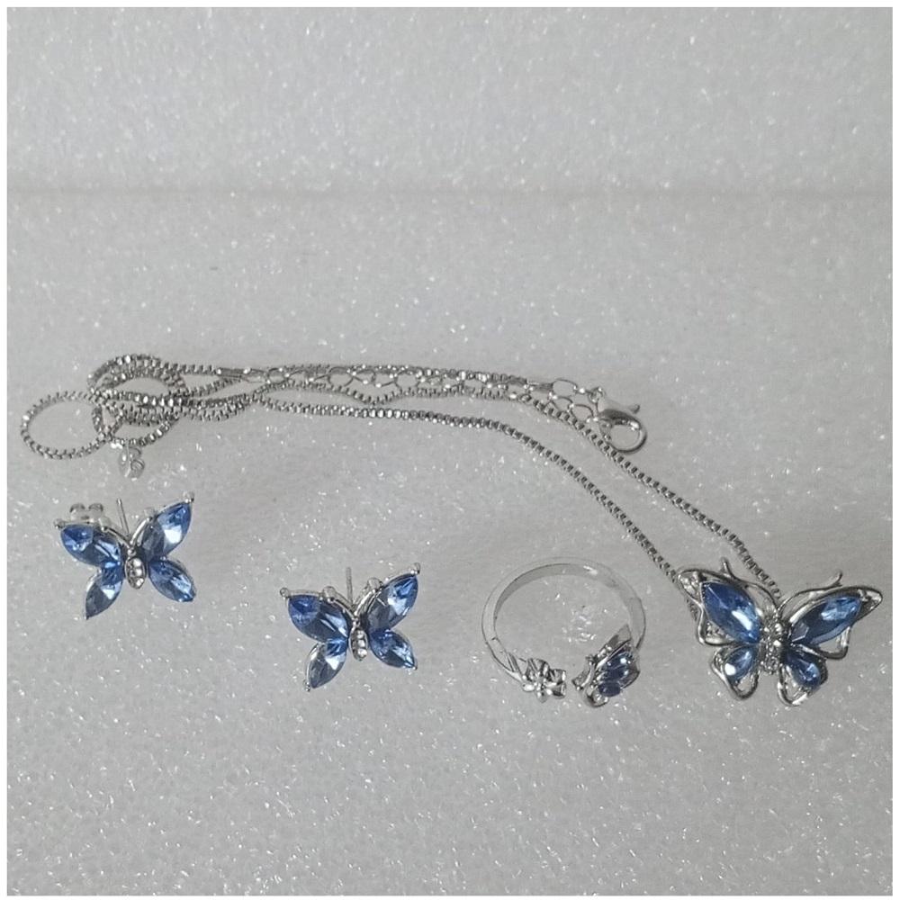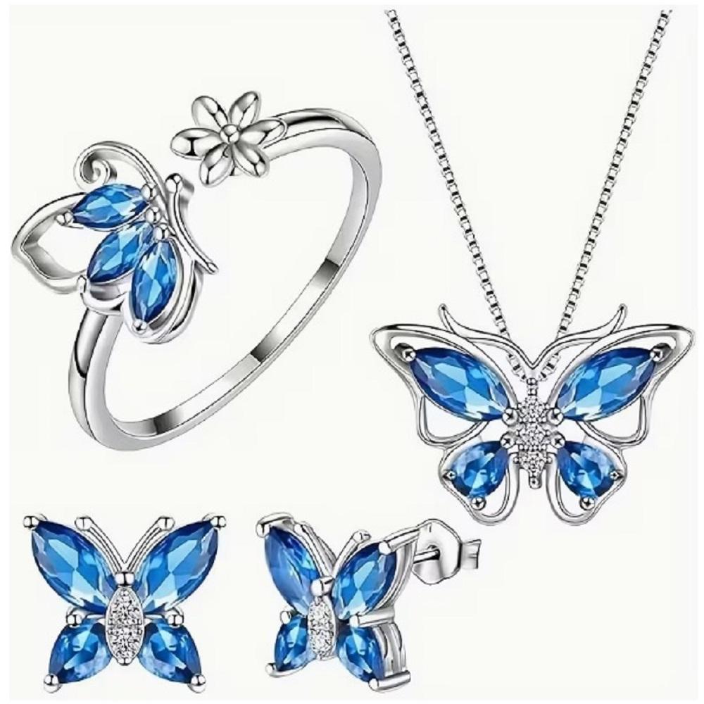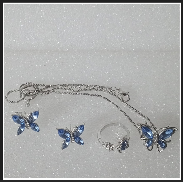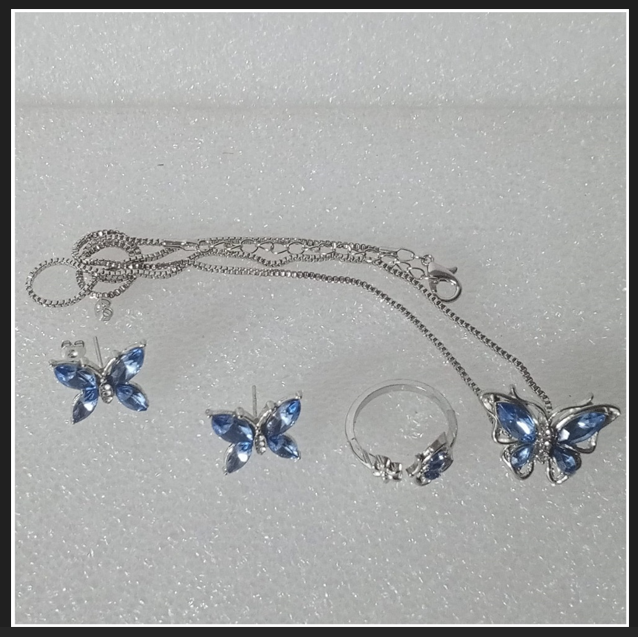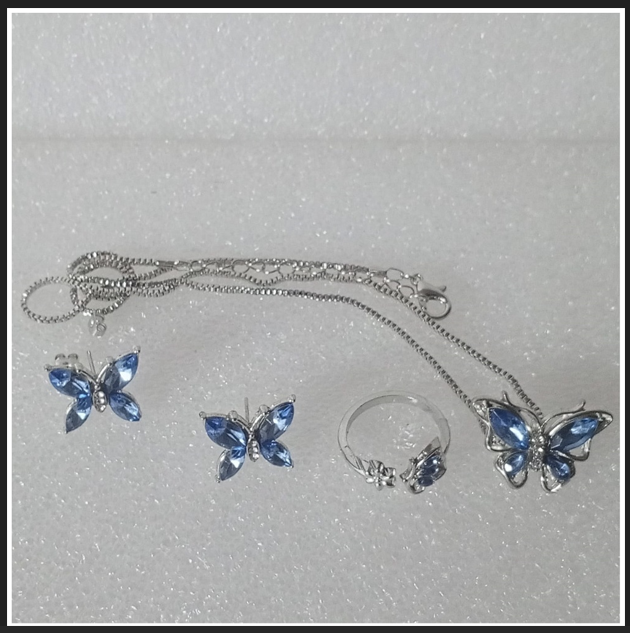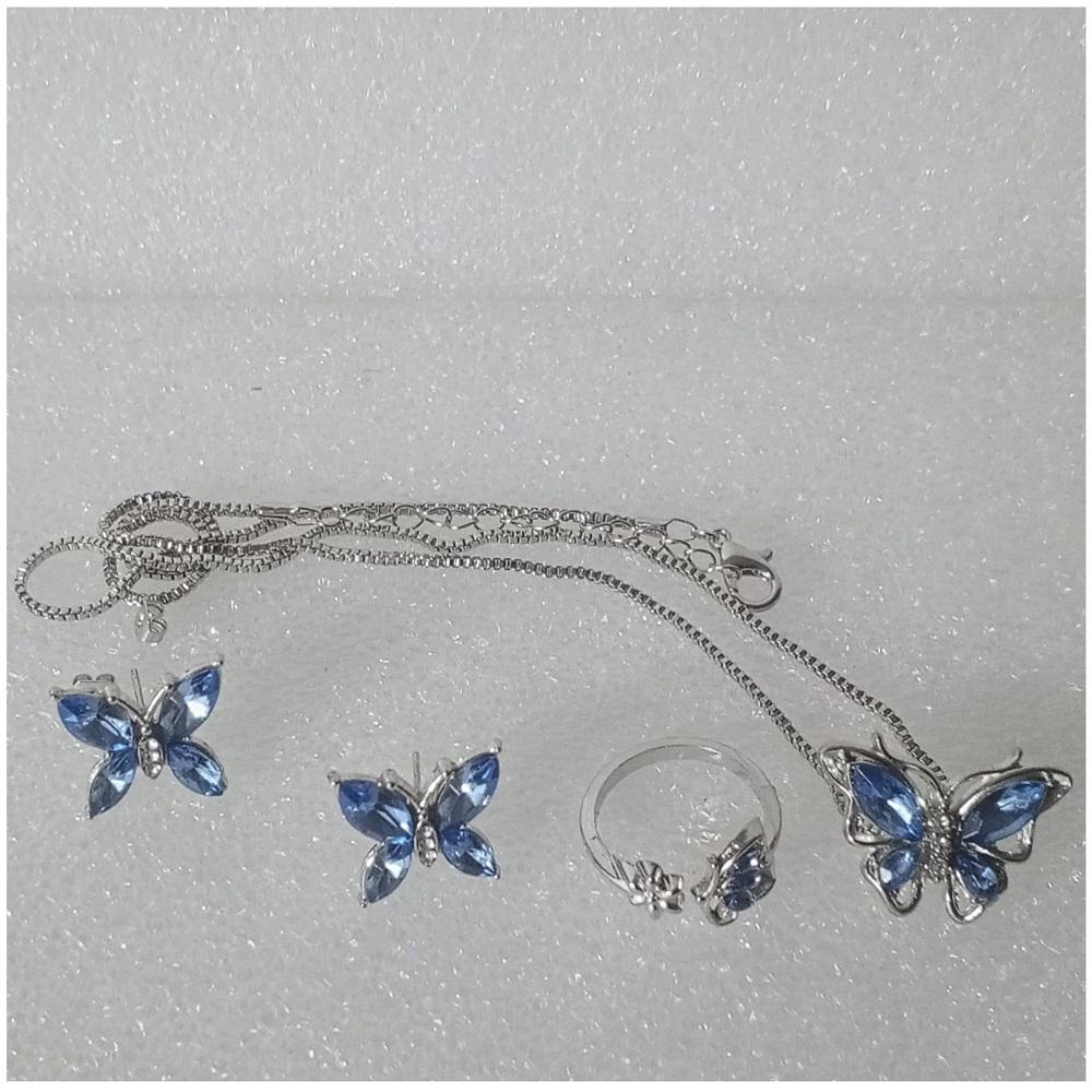 SET GÜNLÜK GİYİM & İŞ YERİ BLUE BUTTERFLY ZİNCİRLİ KOLYE & YÜZÜK & KÜPE SETİ